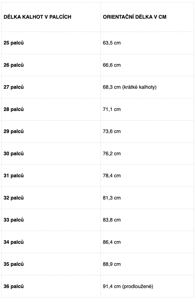 Číslování kalhot v palcích podle délky a obvodu v pase